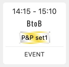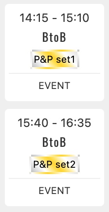 14:15 ~ 15:10「P&P set1」/15:40 ~ 16:35「P&P set2」