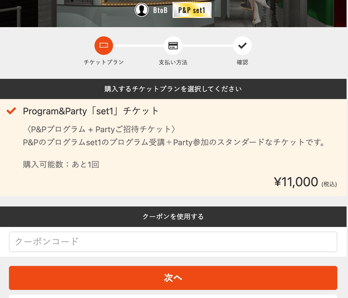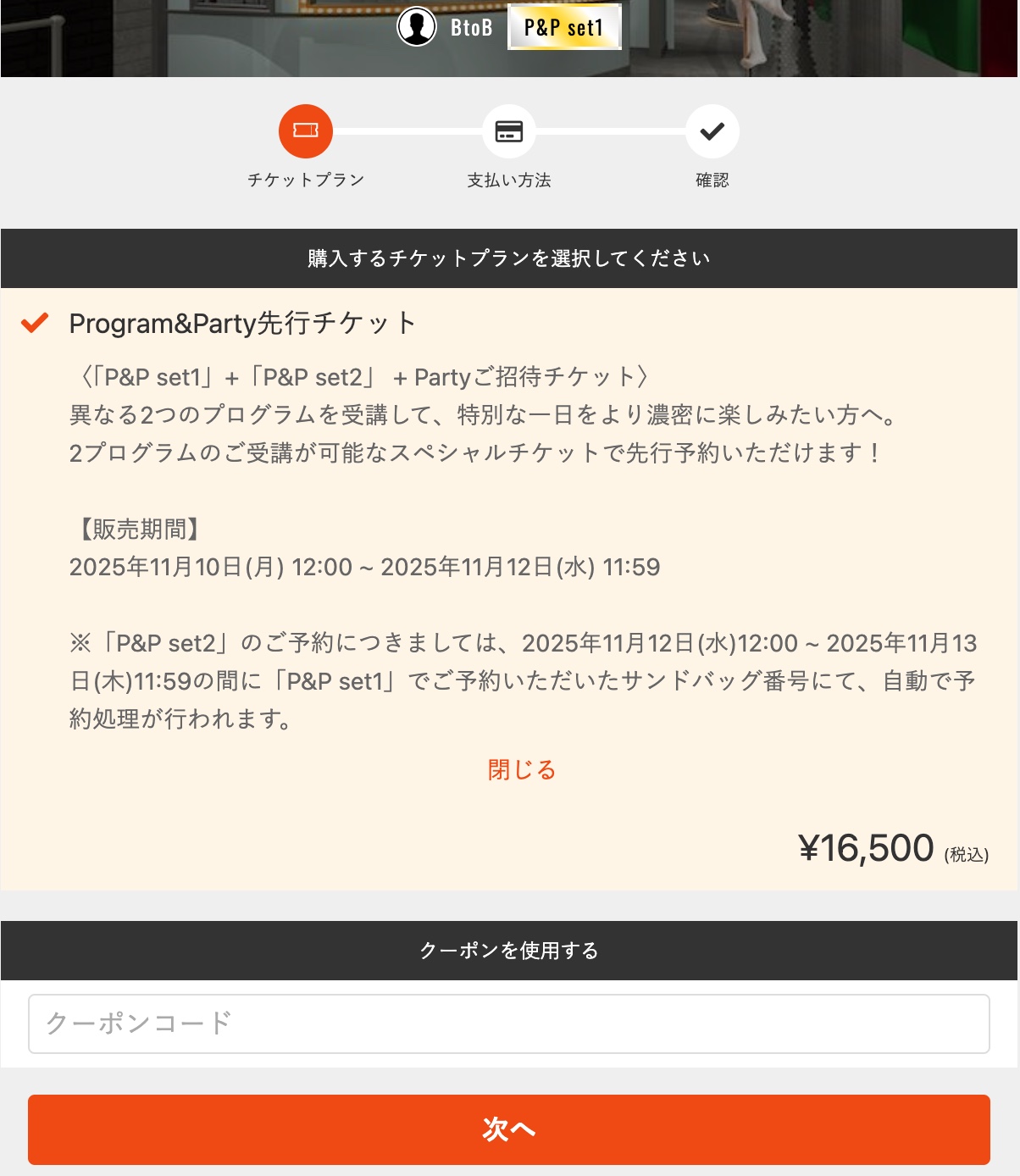 1. b-monster予約サイトにて「P&P set1 」「P&P set2」いずれかご希望のプログラムを選択してください。