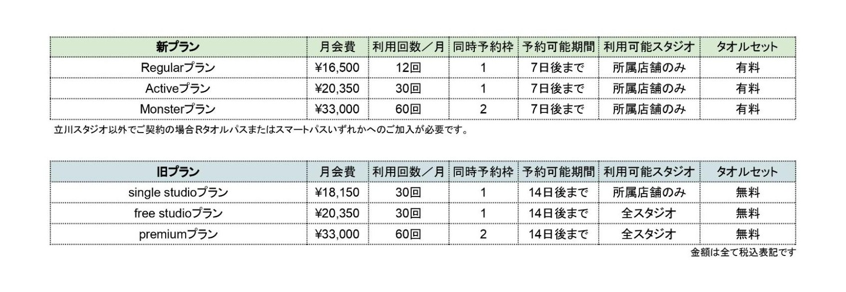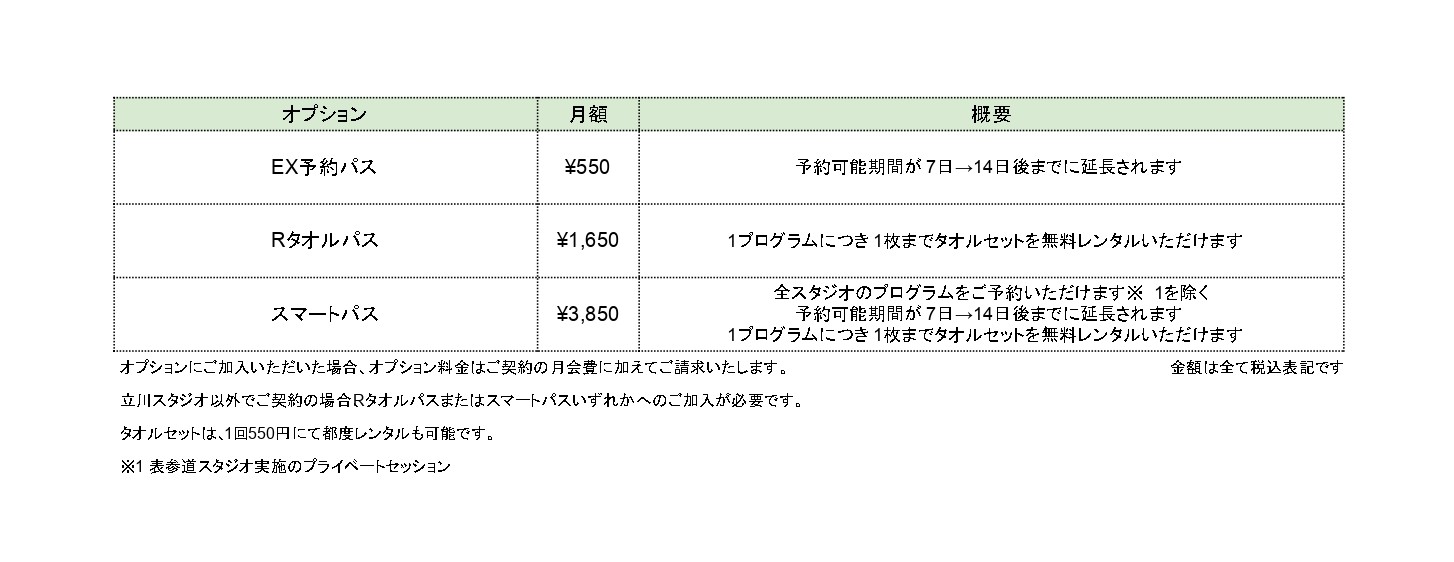 立川スタジオ以外のスタジオを所属店としてご契約いただく場合は、「Rタオルパス」または「スマートパス」のいずれかへのご加入が必要となります。